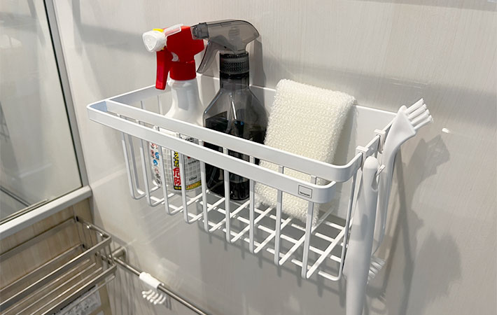 ディスペンサーボトルやチューブ、お掃除グッズなどを浮かせて収納することができ、お風呂場がすっきり片付きます。