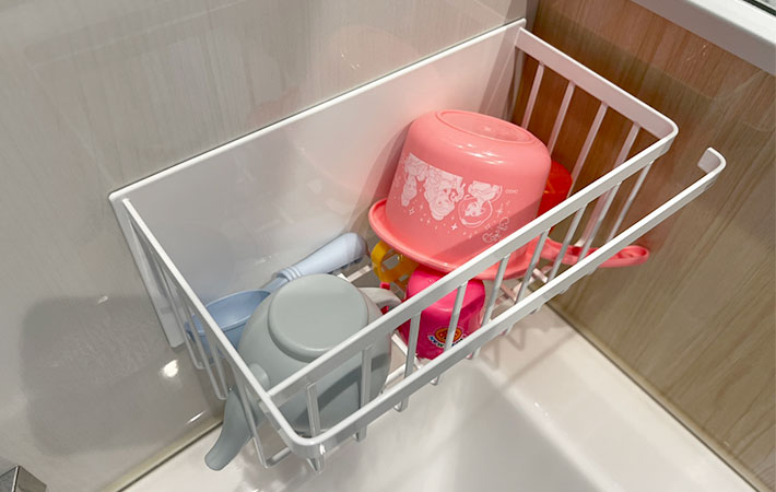 筆者の家のお風呂では、このバスケットを2個設置しており、洗顔チューブやクレンジングオイル、子供用のシャンプーなどのほかに、子供がお風呂場で遊ぶおもちゃを収納しています。