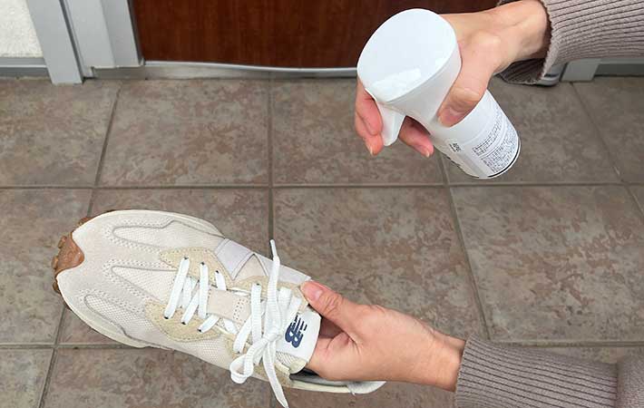 シューズから15cmほど離して、縦に持ち素材にしっかり染み込むまで全体にスプレーします。
