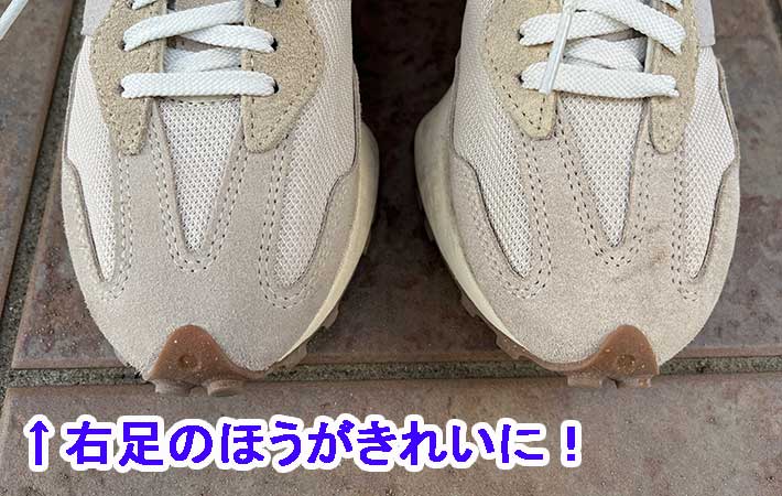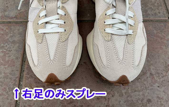 しかし、左右のスエード部分の色をよく見比べると、スプレーしていない左足のほうが水を吸って色が濃くなっています。