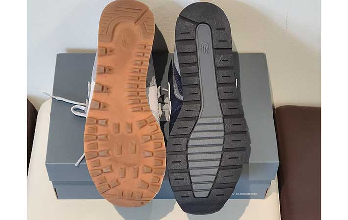 見た目の違いで分かりやすいのがアウトソール。先述したように、996はタウンユースに向いているフラットに近い形状をしているのに対して、574のアウトソールは悪路でも歩きやすい凹凸のある形状をしています。
