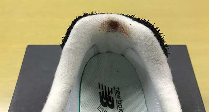 かかとがスレてしまったことで、出血し、白系のニューバランスを汚してしまいました。