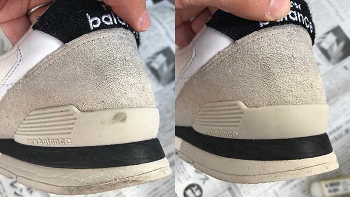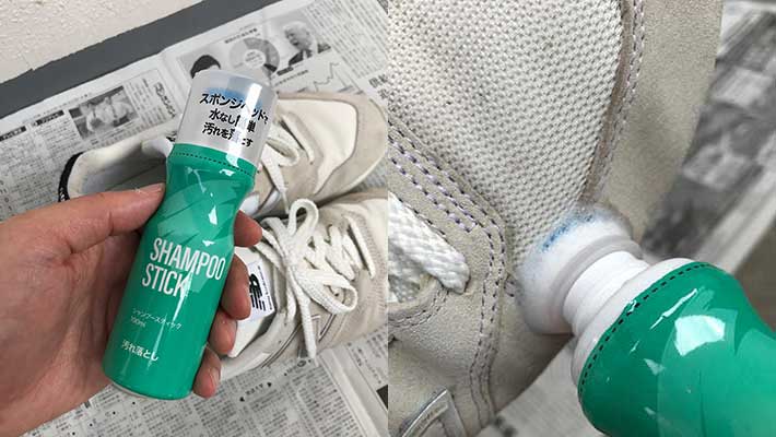 実はドルフィン、目立つ汚れを落とそうと『キャンバススニーカークリーナー』と『シャンプースティック』を使ってニューバランス『996』をセルフクリーニングしていたのです。