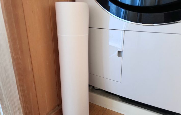 硬いマットではないので、丸めて収納することも可能。省スペースに立てかけて置けるので、洗面スペースが狭くても管理しやすいです。