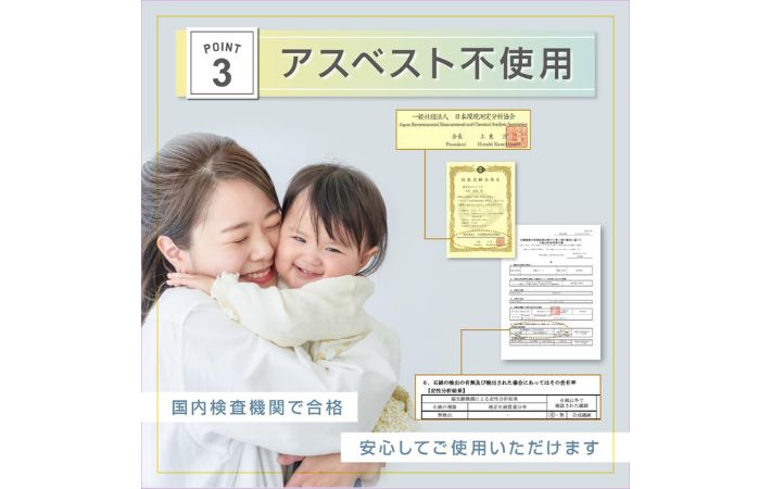 第三者機関による厳格な検査を経て、『ノンアスベスト』であることが証明されているので小さなお子さんやペットがいる家庭でも安心して使うことができます。