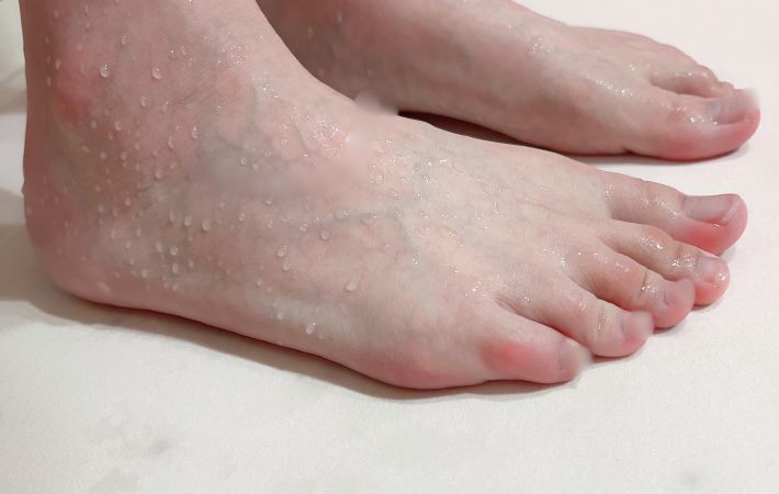 従来のマットよりもお風呂上がりの足に残った水滴を瞬時に吸い取ってくれて、ベタつきや不快感をほとんど感じさせないとのことで、実際に水を垂らしてみると…。