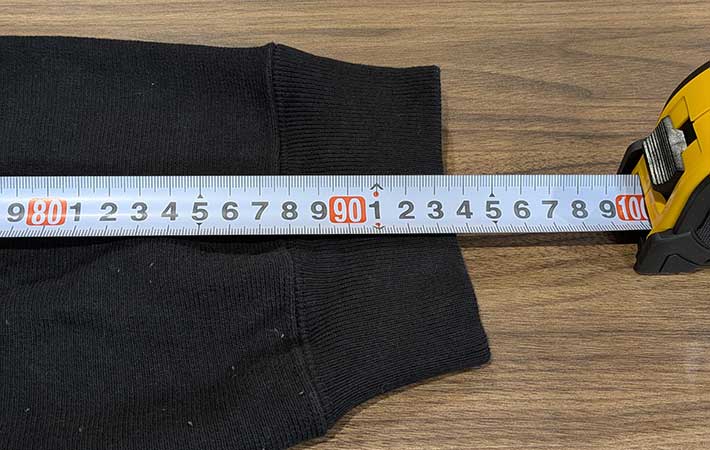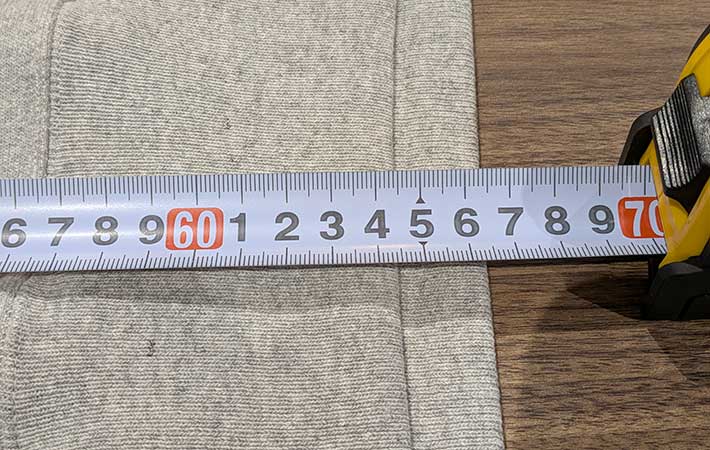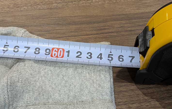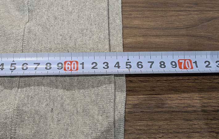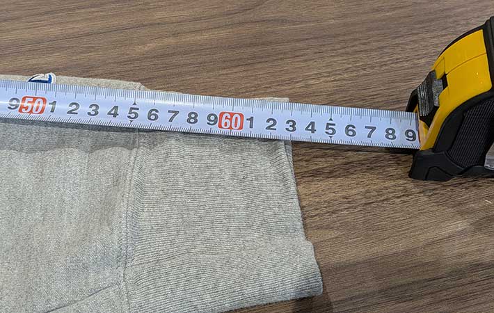 ちなみに、上下ともにXLサイズを使用。まずは新品の状態で縦方向の計測を行います。