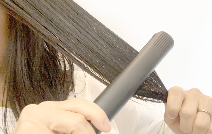 サイドの髪1束分を『ストレートヘアアイロン』で挟んで、上から下へまっすぐアイロンしていきます。