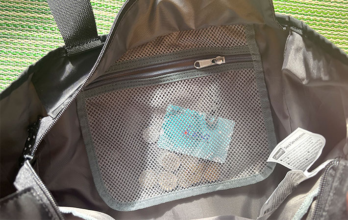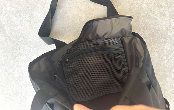 メッシュポケットには、ジムの会員証やコインロッカー用の小銭を常備。中のものが一目で分かるので、取り出しがスムーズです。