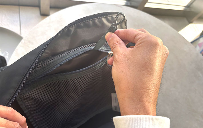 メッシュポケットの中にはキーフックがついているので、ここに鍵を引っかけておけばバッグの中で迷子になることもありません。