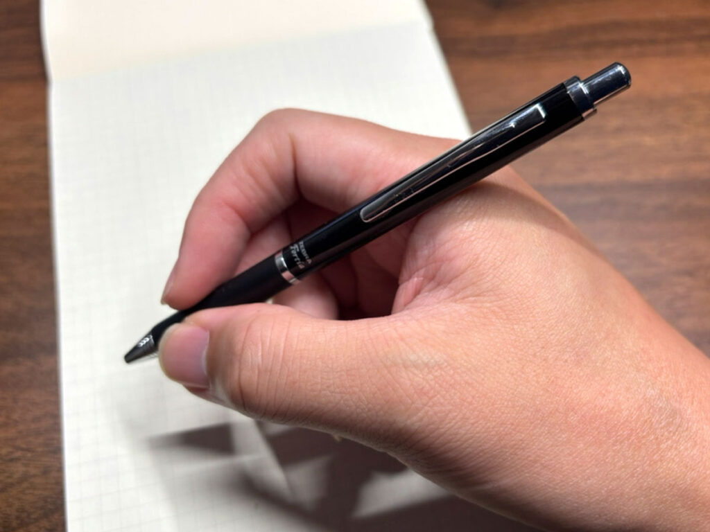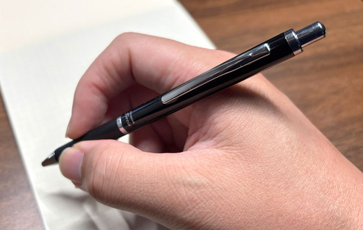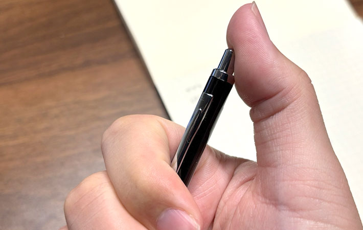 細くて軽いボールペンは持ちにくいことが多いのですが、『フォルティア300』は程よい重さによってうまくカバーしている印象です。