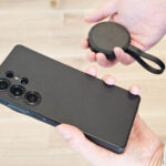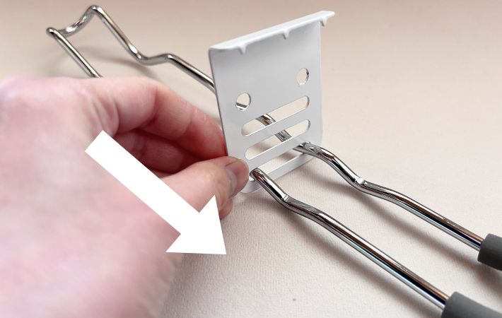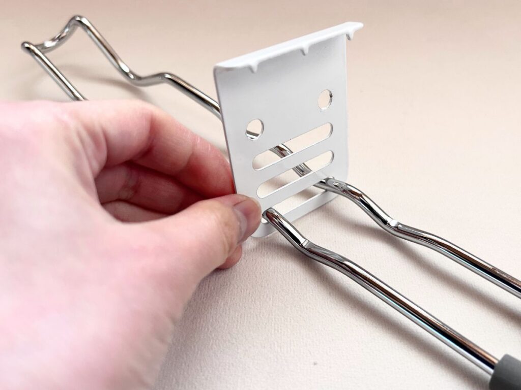 まず画像のように本体を止め具の穴に差し込み、滑り止めのあるほうへスライドさせます。