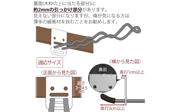 ただし、ツメは枠に触れてしまいます。気になる場合はマスキングテープや薄手の緩衝材などを挟んで取りつけると、さらに安心して使えますよ。