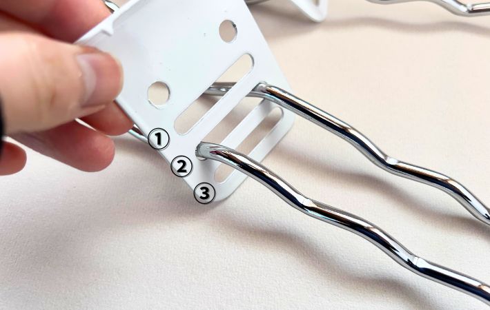 設置した時にフック本体が水平か少し斜め上になる状態がベストです。それに合わせて差し込む穴の位置を調整してください。