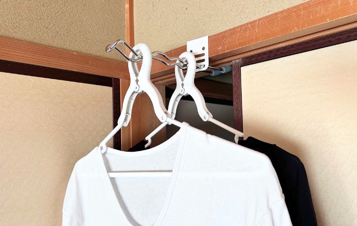 ちなみに耐荷重は、1個使用で3kg、2個使用で6kgとのこと。冬物のパーカーやニットジャケットなど重さのあるものや大きめのピンチハンガーも余裕で掛けられます。