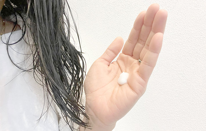 先ほどと同様、適量の『エッセンスインヘアミルク』を手に取り、髪の半分側のみに塗布。