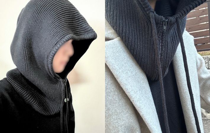 『THE HOOD KNIT』は、寒い日のお出かけを快適にしてくれる工夫が詰まったフード型ネックウォーマーです。