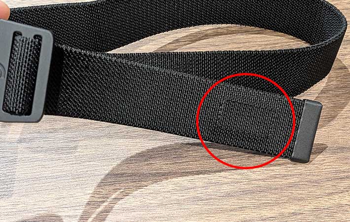 長さを調節するバックル側のベルト部分にロゴが縫いつけてありますが、これはベルトの裏側。