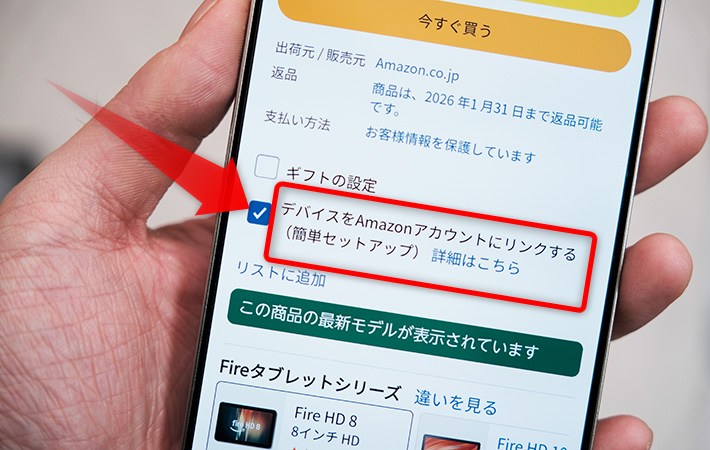 販売ページにある『デバイスをAmazonアカウントにリンクする』という欄にチェックを入れてから購入すると、購入時のAmazonアカウントが設定された状態で届きます。
