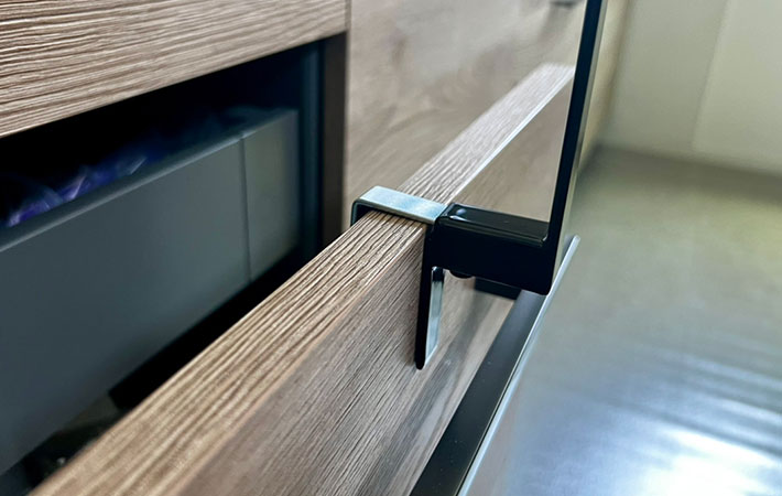 キッチンのシンク下の扉や引き出しに設置でき、フックを調整してネジでとめるだけです。