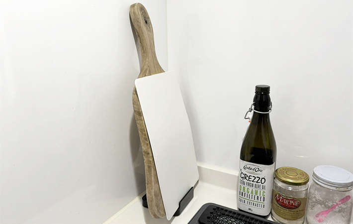 スリムな形状なので、木のまな板と一緒に使用しても置き場所に困りませんよ。