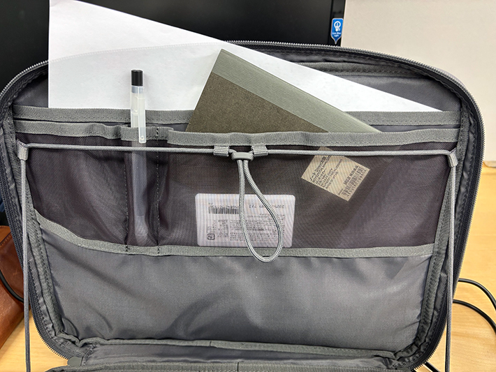 ポケットには、A4サイズのファイルや書類、筆記具、スマートフォンなどが収納できて便利ですよ。