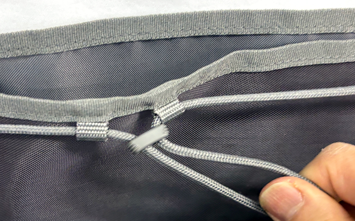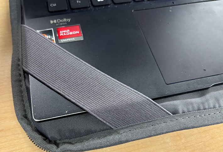 ファスナーを開けると現れたのは、パソコンを固定するベルトとアジャスター付きの紐です。