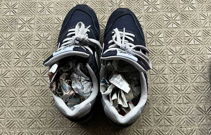 最初はニューバランス『996』の中に古新聞を入れて、水分を吸わせようと試みましたが、あまり効果がなく…。