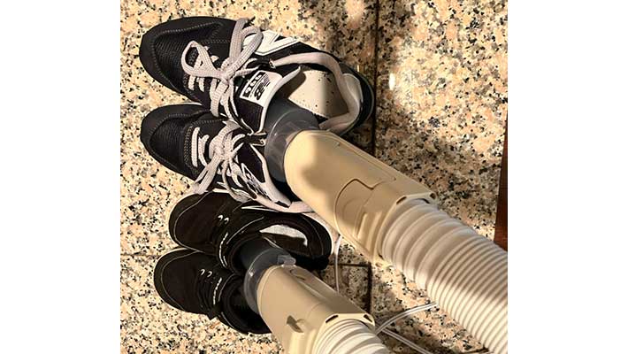 翌日、キャンプに履いて行く予定だったので、最後は布団乾燥機のチューブをスニーカーの中に入れました(笑)。