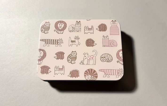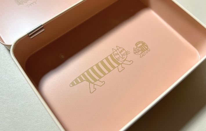 梱包を解いて、まず目に飛び込んできたのはくすみピンク色のブリキのケース。