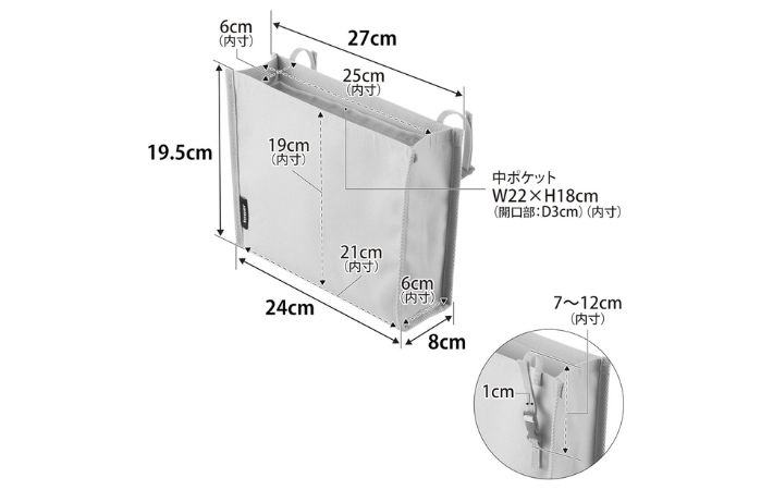 内寸:収納部:幅25cm×マチ6cm×高さ19cm 中ポケット:幅22cm×高さ18cm(開口部:マチ3cm) ループ部の長さ:7~12cm
