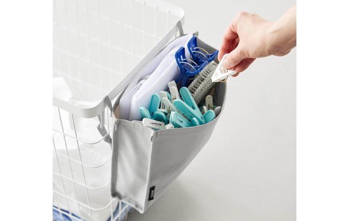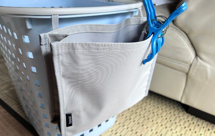 山崎実業の『洗濯カゴに取り付けるピンチ&ネット 収納ポケット』は、洗濯まわりの小物をスッキリまとめられる家事のお役立ちアイテムでした。