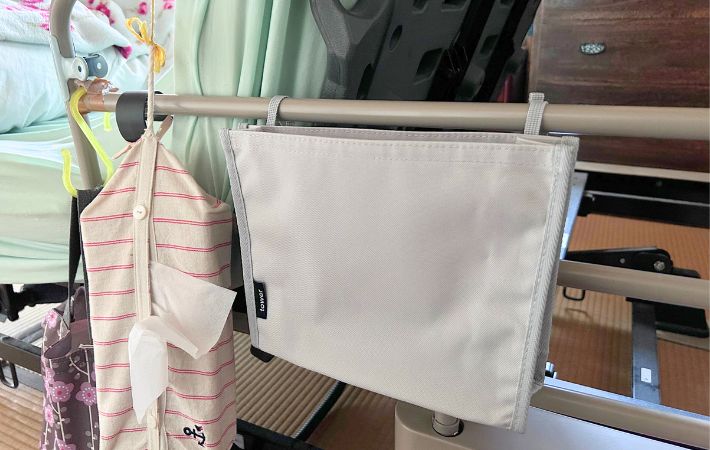 例えば、ベッドサイドに取りつけるとリモコンや充電器、本、ボディクリームなどの小物をひとまとめにできる収納アイテムに変身。