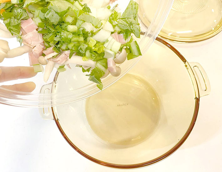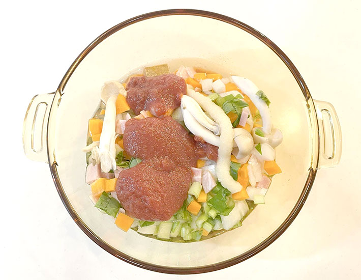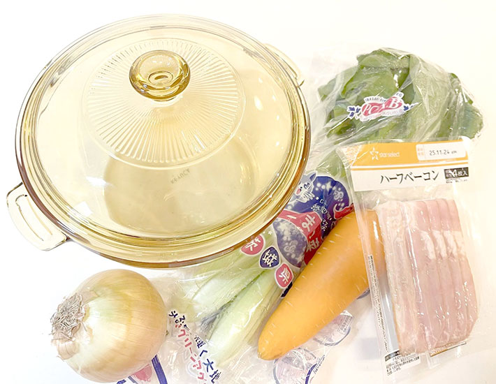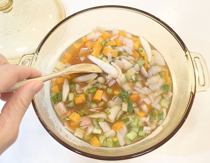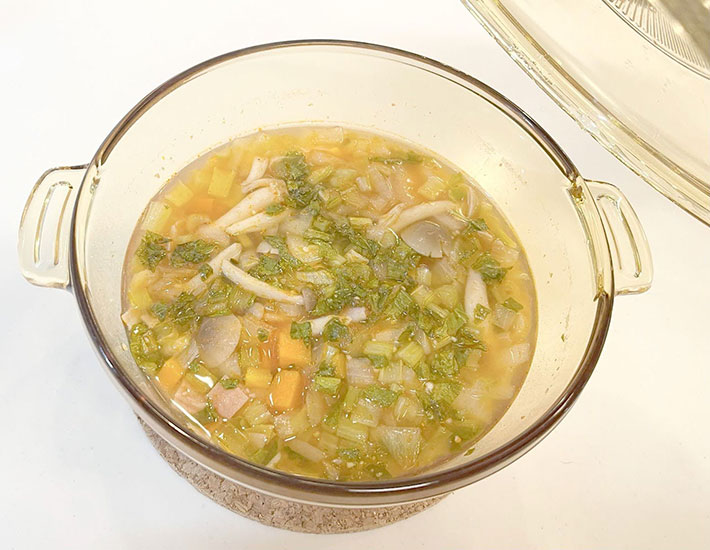 食材の量に対して水をやや少なめに入れたものの、野菜からたくさん水分が出てボリューム満点のスープに仕上がりました。
