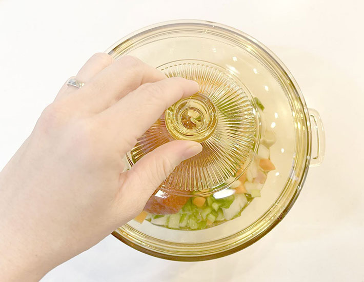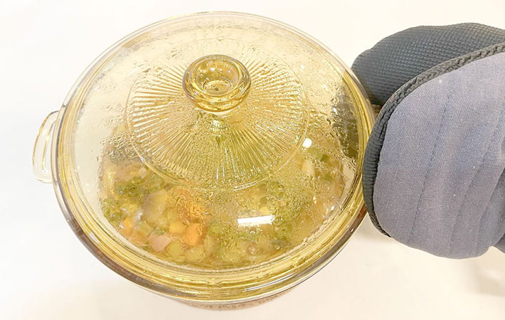ヤケド防止のためにも、加熱直後のキャセロールに触れる際は必ず鍋つかみや厚手のタオルなどを使ってくださいね。