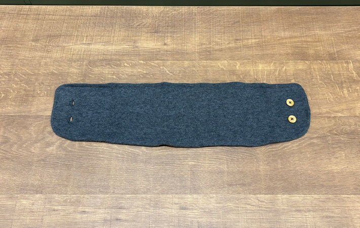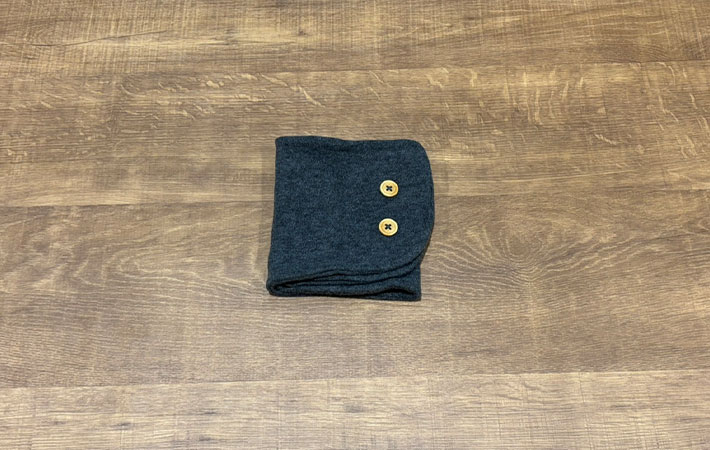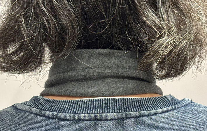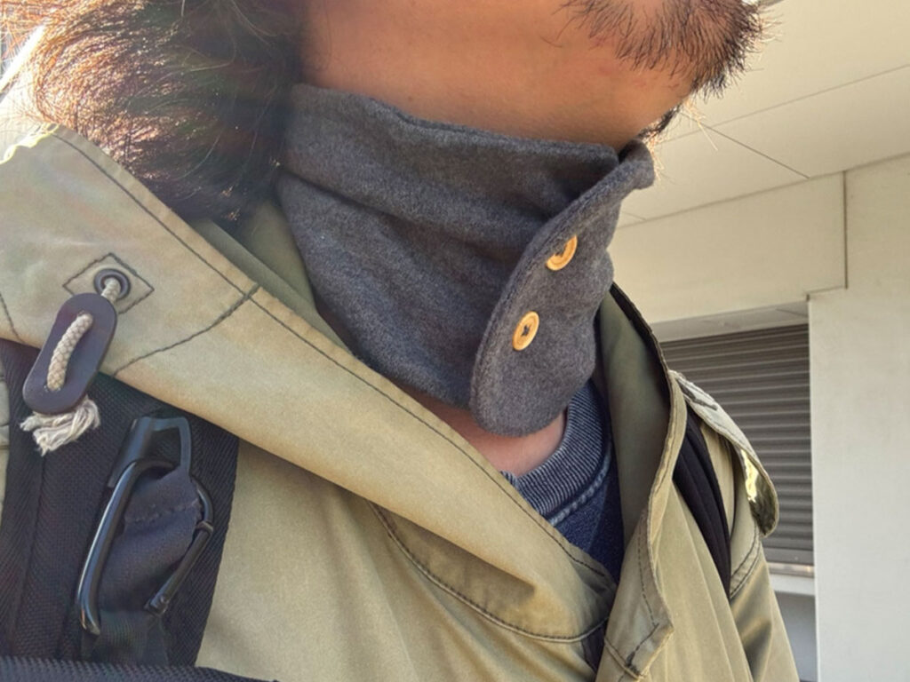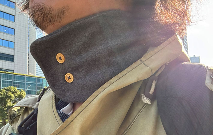 このネックウォーマーはボタンで留めるタイプで、頭から被る必要がありません。髪型を崩したくない人にも使いやすい形です。