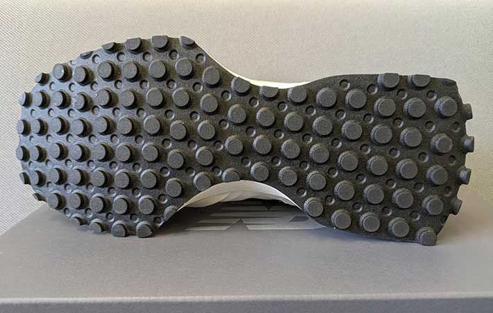 凹凸が激しく、ヒール上部までせり上がった、印象的なMS327のアウトソール。グリップ力の強そうな見た目をしています。