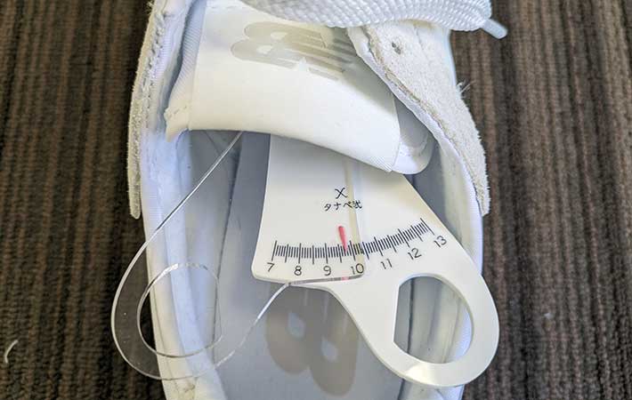 27cmサイズのMS327の横幅を計ってみると、約9.8cm。同サイズのCM996が約9.6cmで、ML574は約9.4cmだったことを考えると数値的にも余裕があることが分かります。