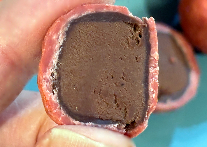 周りは甘酸っぱいイチゴ味でコーティングされていて、半分に割ってみると、中には生チョコがびっしりと詰まっているではありませんか!