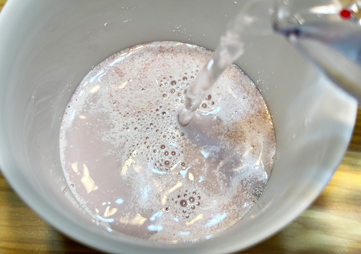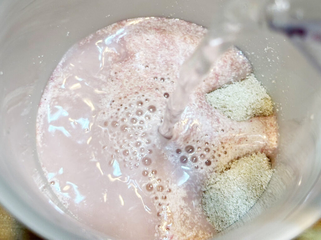 白かったはずの粉が、みるみるうちにきれいな桜色へと変わっていくではありませんか!