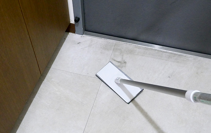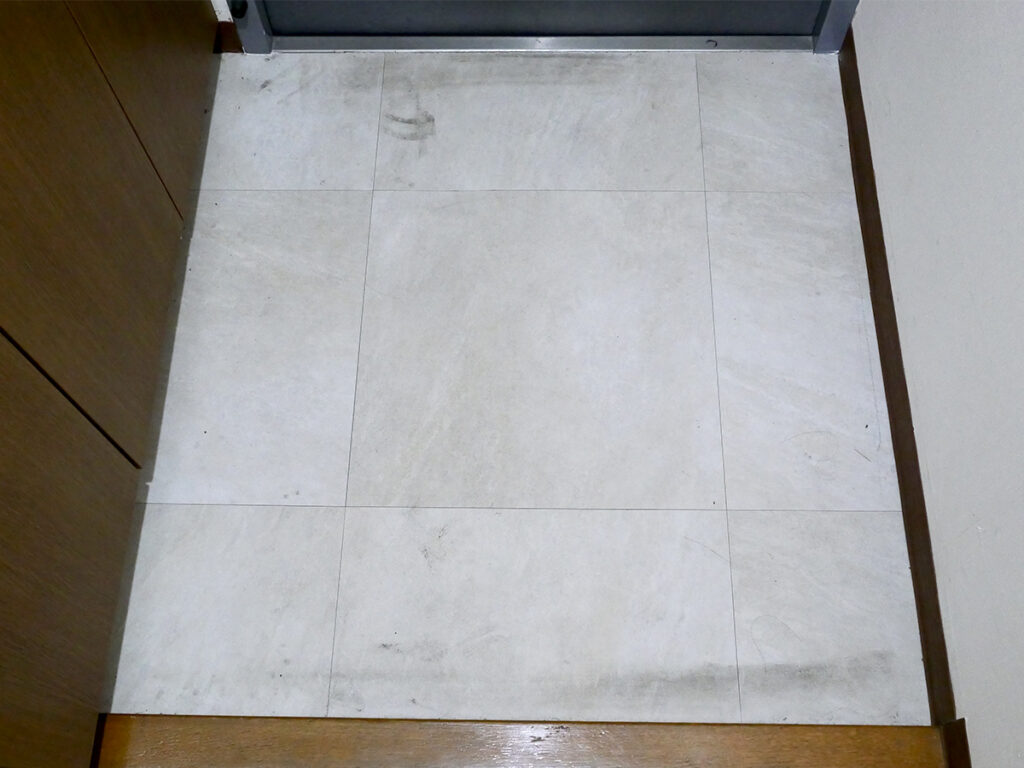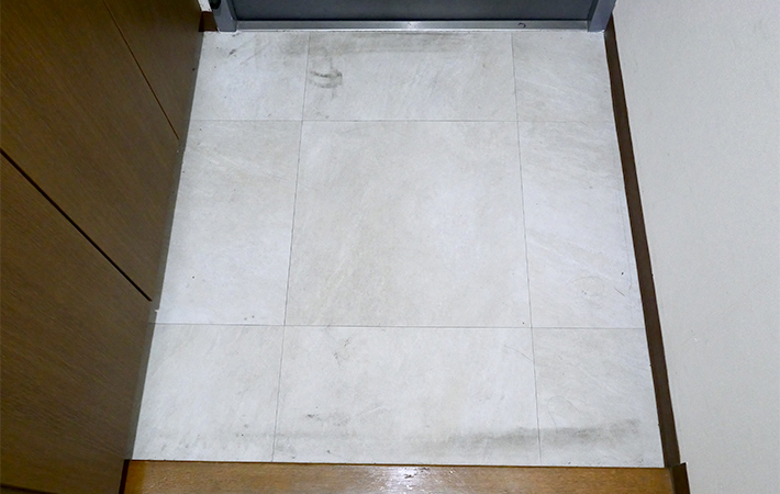 ドア付近だけではなく、玄関タイル全体をこすっていきましょう。