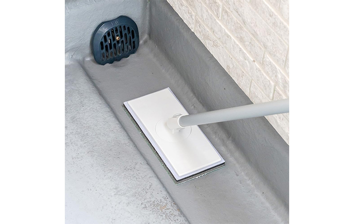 ブラシをあらかじめ濡らしてから本体に装着。ドア付近のタイルからこすっていきます。