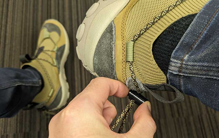 スポッと足を入れたら、ギュッと紐を引っ張れば自分の足に合ったフィット感に調整ができます。