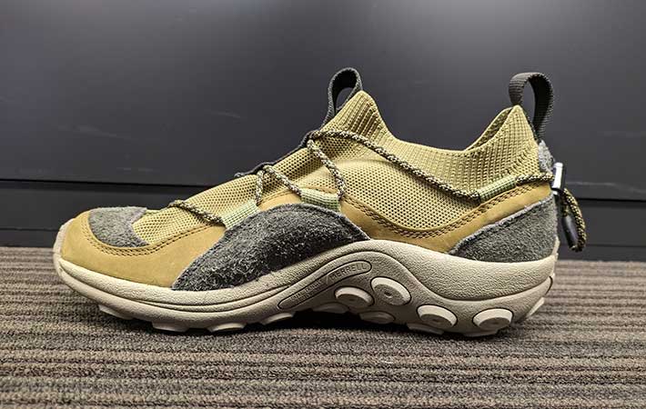 対して、ジャングルモックエクスプローラーは、アッパーのデザインを大幅に変更。ソールとのつなぎ目にピッグスエードレザーを使用していますが、多くの部分は足にフィットしやすいニット素材が使われています。