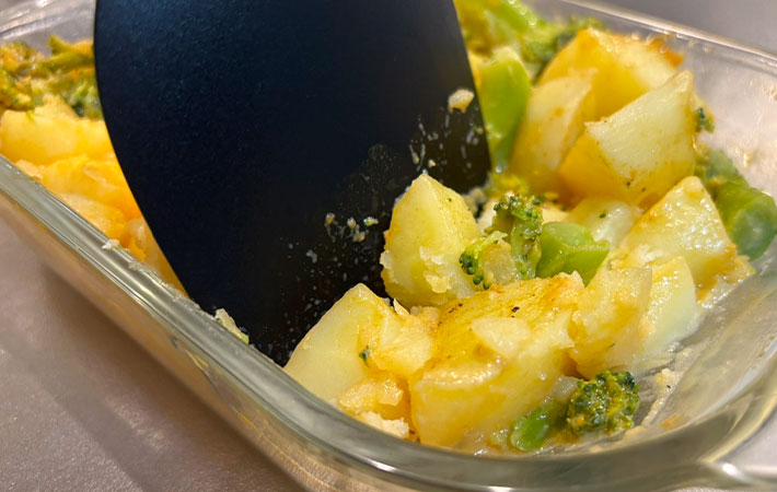 筆者は洗い物を減らすためにグラタン皿にそのまま入れましたが、浅いグラタン皿は牛乳の吹きこぼれに注意!筆者は少し吹きこぼれてしまいました…。