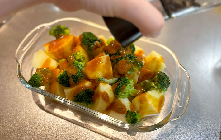 耐熱容器にじゃがいも、ブロッコリー、牛乳、黒こしょう、そして『あえるだけのパスタソース 海老クリーム』を入れてラップをかけ、600Wの電子レンジで12分加熱します。
