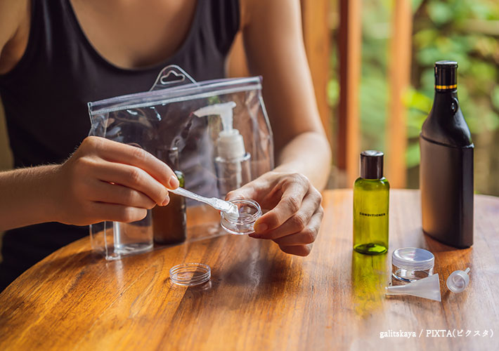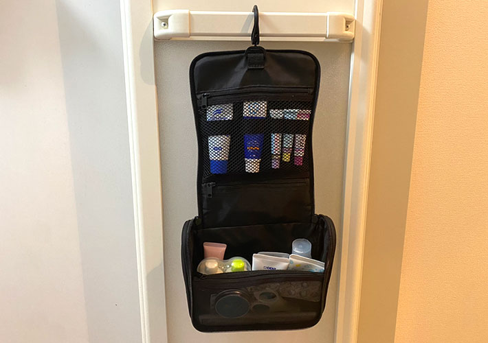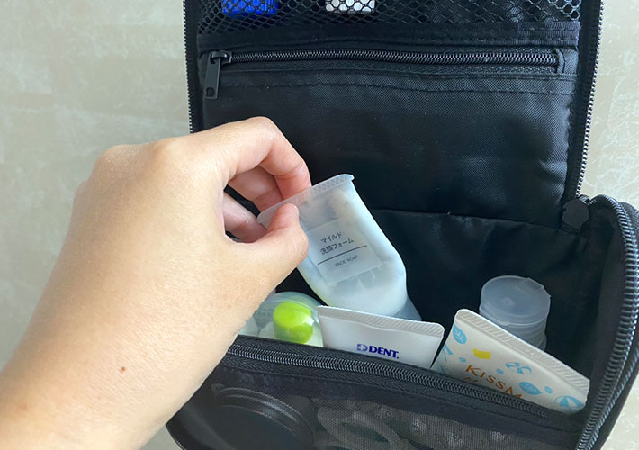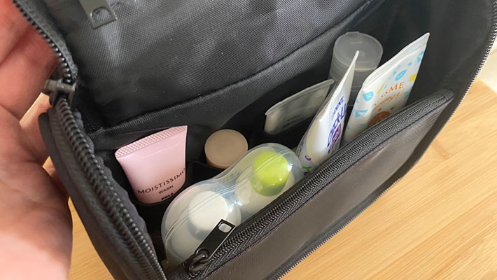 小さくてバラバラと散らばる携帯用のスキンケア用品や洗面用具をいつもここに入れておけば、必要な時に中身を補充するだけでOK。