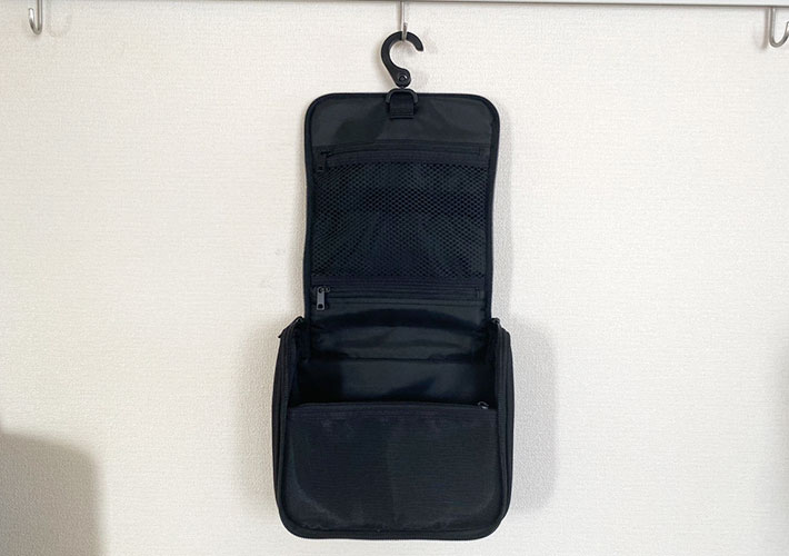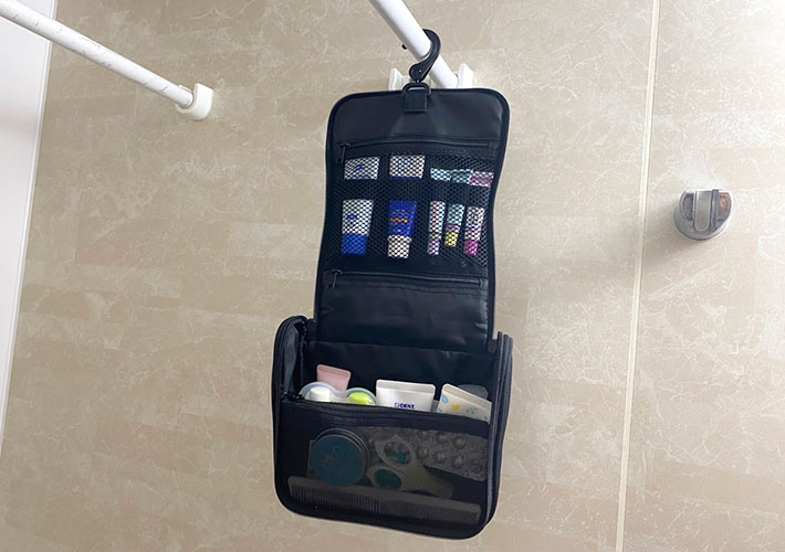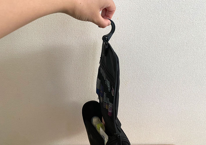 それでは、『ポリエステル吊るして使える洗面用具ケース』の真骨頂、吊るして使ってみましょう。