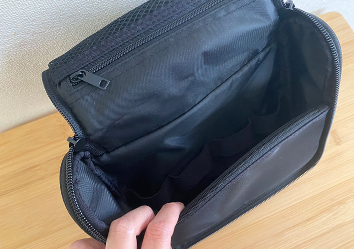 内側に小分けボトルやチューブ類などを差し込んで固定できるゴムバンドが4か所付いています。