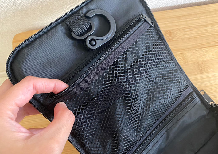 ファスナーを全開にして広げると、フタのトップに引っかけられるフックが登場。